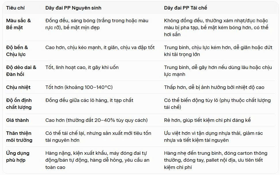Dây đai PP nguyên sinh được sản xuất từ hạt nhựa nguyên chất lần đầu, trong khi dây đai PP tái chế được làm từ nhựa tái sinh sau quá trình tái chế. Mỗi loại đều có những ưu điểm riêng về độ bền, khả năng chịu lực, giá thành và tính thân thiện với môi trường.